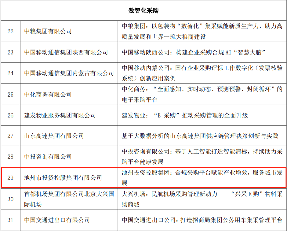 近日,中國物流與采購聯(lián)合會(huì)公共采購分會(huì)面向國企采購領(lǐng)域征集優(yōu)秀案例活動(dòng)公布了評(píng)審結(jié)果,池州市投資控股集團(tuán)有限公司合規(guī)采購平臺(tái)以“合規(guī)采購平臺(tái)賦能產(chǎn)業(yè)增效,服務(wù)城市發(fā)展”為題,獲評(píng)2024年度全國公共采購數(shù)智化采購優(yōu)秀案例。