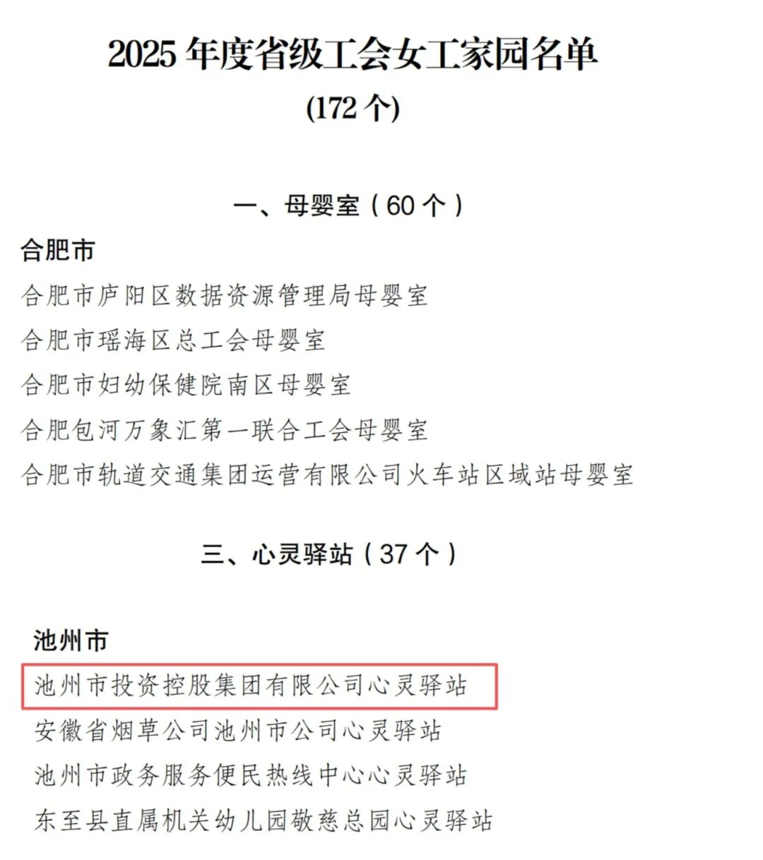 近日,安徽省總工會(huì)印發(fā)《關(guān)于公布2025年度省級(jí)工會(huì)女工家園名單的通知》,集團(tuán)工會(huì)申報(bào)的省級(jí)工會(huì)女工家園心靈驛站項(xiàng)目順利通過評(píng)審,成功躋身省級(jí)女職工關(guān)愛服務(wù)陣地行列,這是集團(tuán)工會(huì)深耕女職工權(quán)益保障、做實(shí)人文關(guān)懷工作的重要成果。