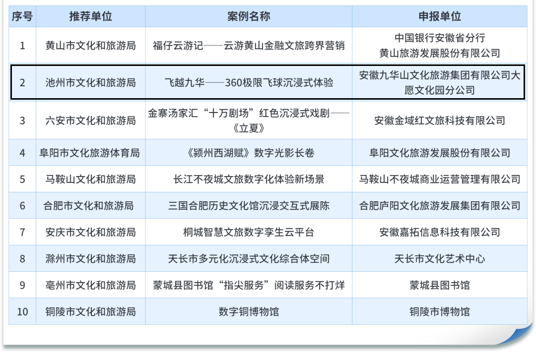 12月26日,安徽省文化和旅游廳公布2023年數(shù)字文旅創(chuàng)新實踐十佳案例名單,集團所屬大愿文化園分公司申報的項目“飛越九華——360極限飛球沉浸式體驗”榜上有名!??!