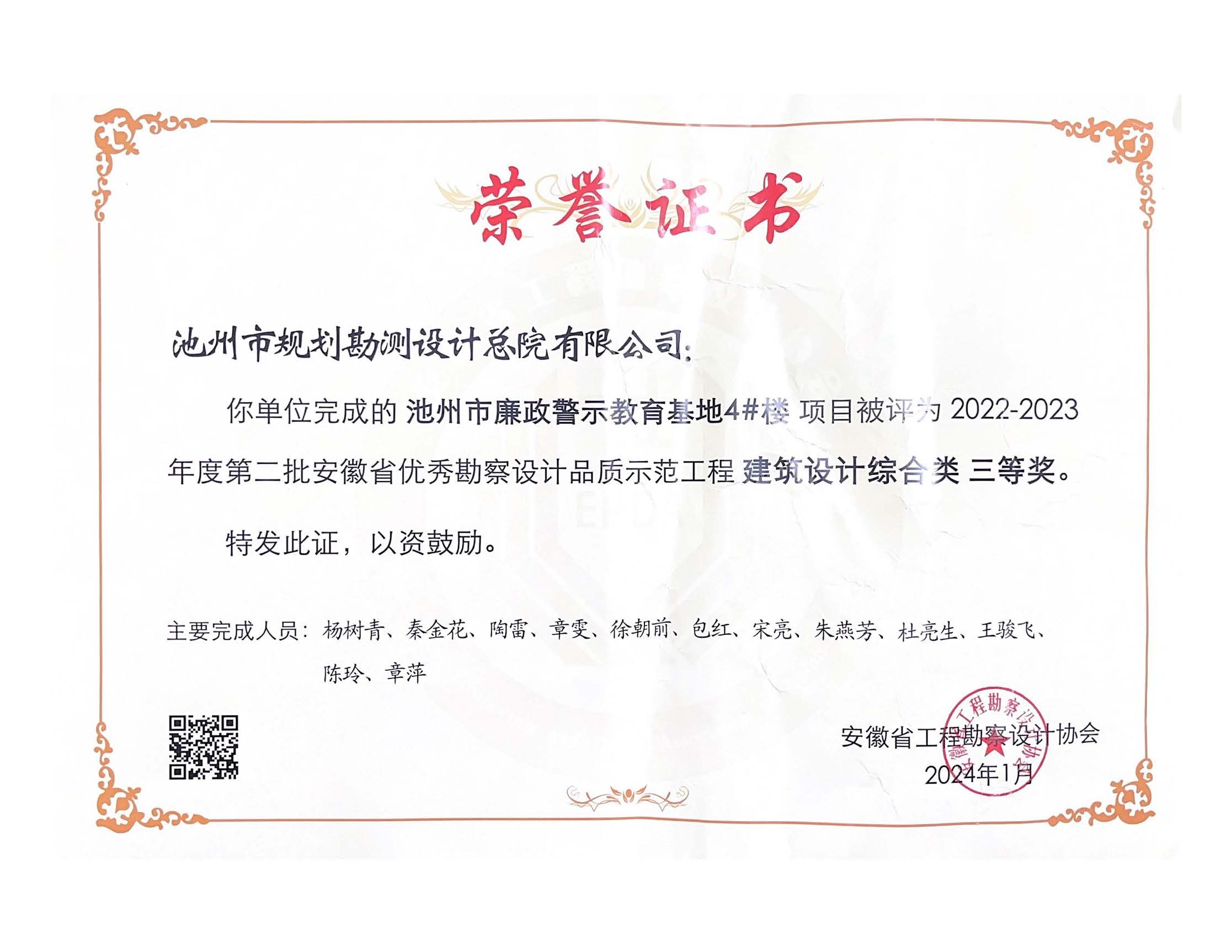 近日,2022-2023年度第二批安徽省優(yōu)秀勘察設(shè)計品質(zhì)示范工程名單公布,池州市規(guī)劃勘測設(shè)計總院有限公司憑借“池州市廉政警示教育基地4#樓設(shè)計項目”榮獲建筑設(shè)計綜合類三等獎。