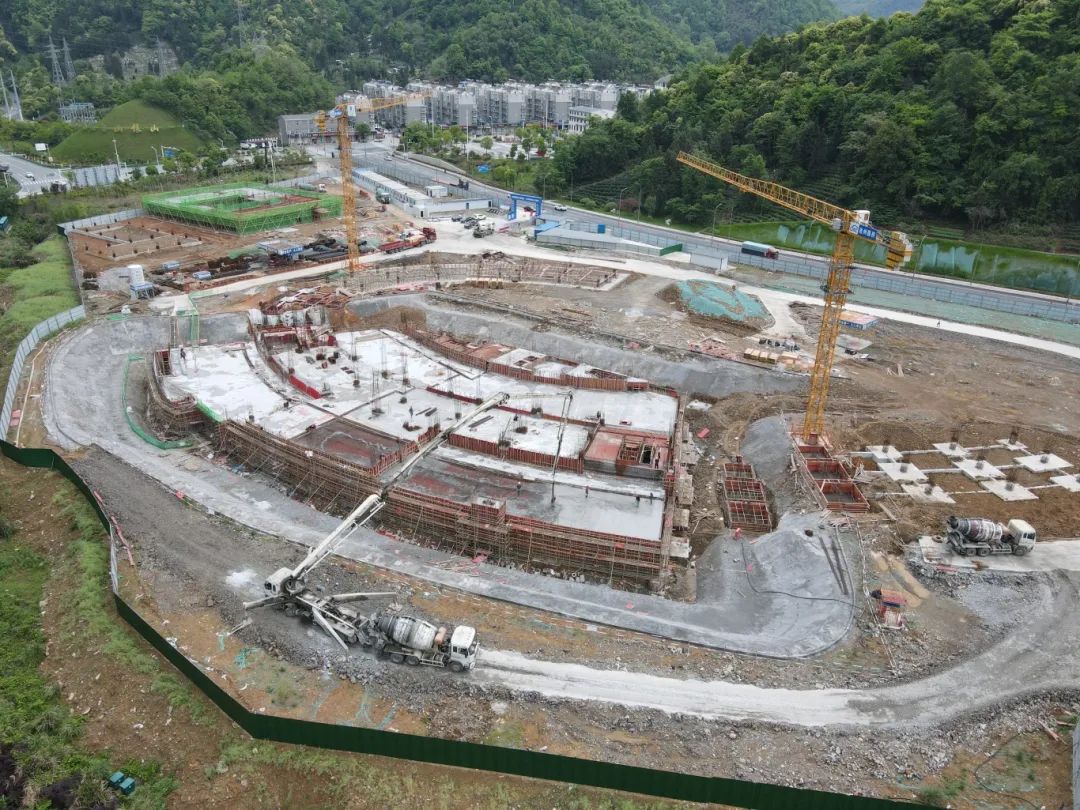該項目于2023年10月13日開始樁基工程施工,至今已完成酒店地下室深基坑支護、樁基礎(chǔ)、地下室底板砼澆筑、頂板鋼筋綁扎以及非地下室區(qū)域基礎(chǔ)施工,頂板砼于今日澆筑完成;宿舍樓二層樓面正在綁扎梁板鋼筋;設(shè)備用房基礎(chǔ)已完工,正在施工一層地面。